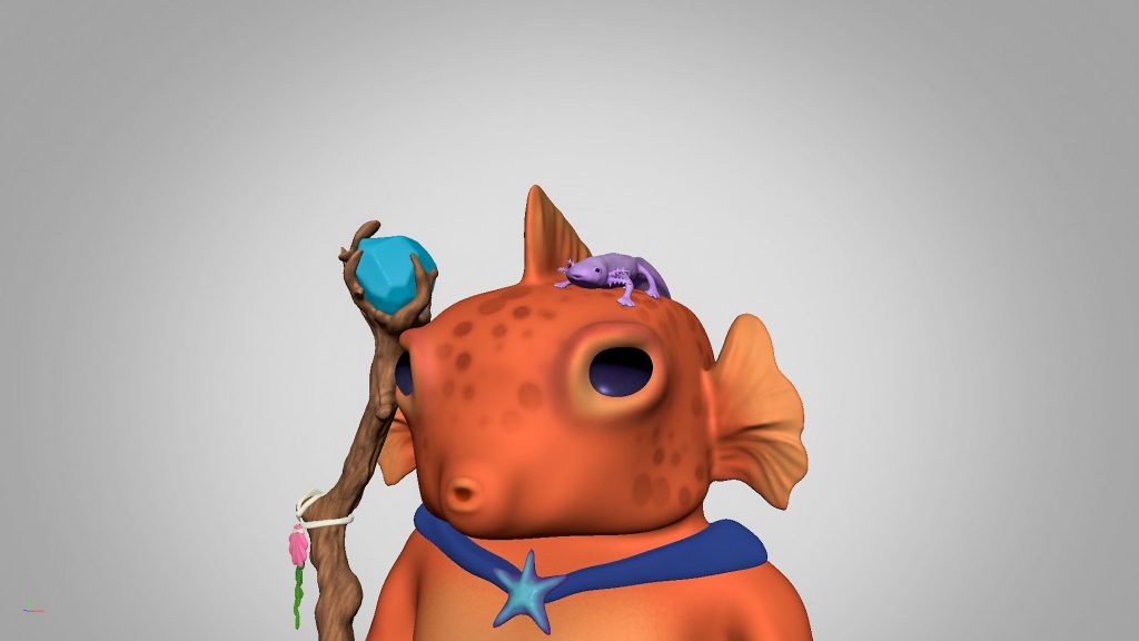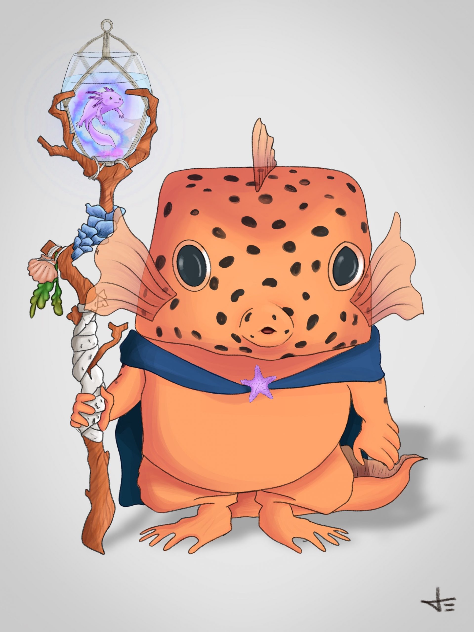 The fish is called Russel and the axolotl on the head is Detlev. I designed them both for a Dungeons and Dragons game I played with my friends.